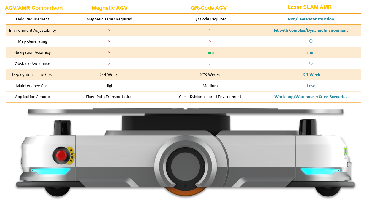 AMR (Autonomous Mobile Robot) means robot performs behaviors or tasks with a high degree of autonomy, integrated edge technologies including AI, robotics and information engineering; usually classified by navigation type, where Visual SLAM (Simultaneous Localization and Mapping) and Laser SLAM are the most common form.